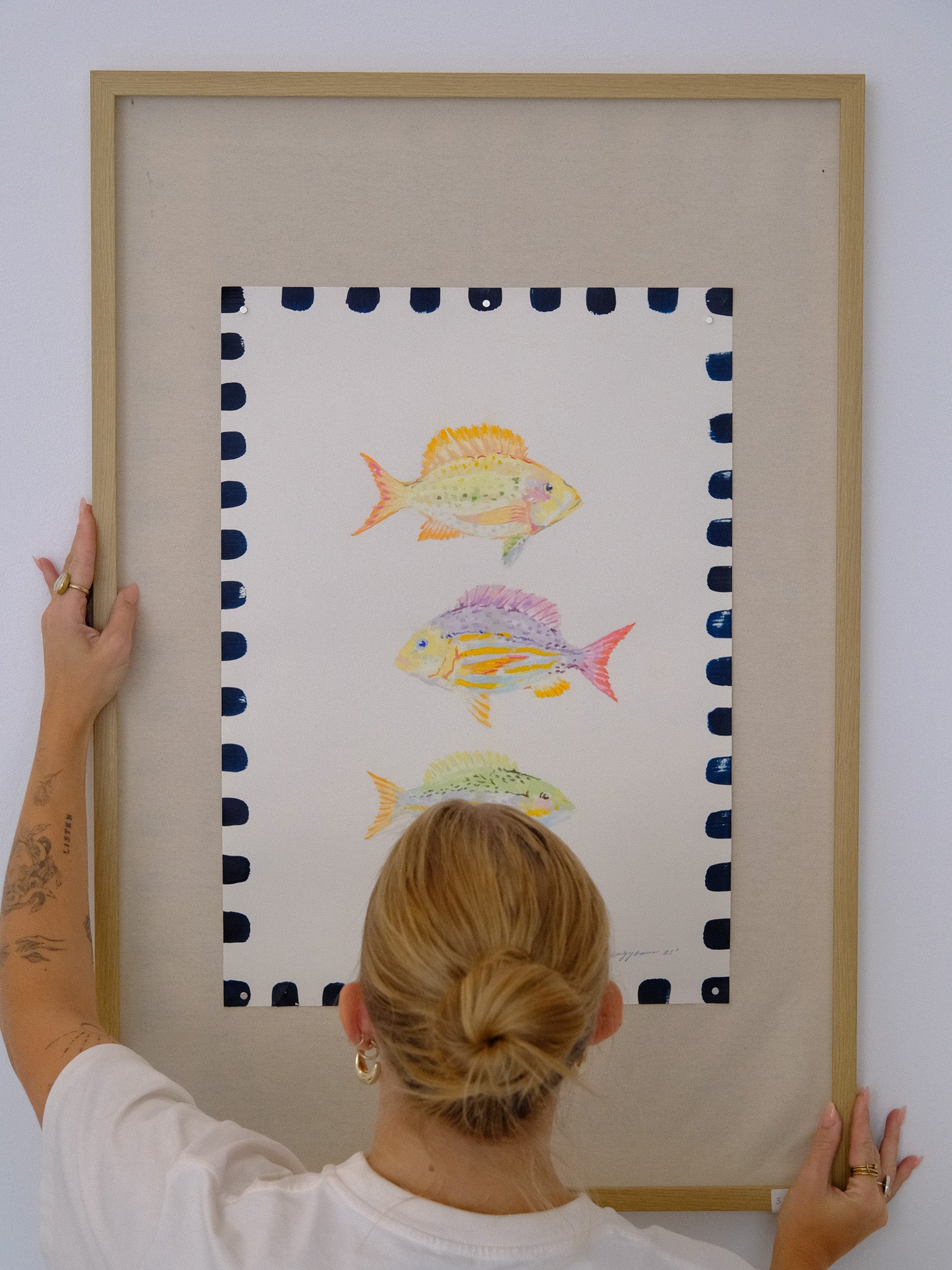 “Three Wise Fish” is an original artwork that captures quiet intuition beneath the surface. Three figures drift in unison — contemplative, fluid, and resonant with subtle meaning. The composition feels both meditative and alive, offering a visual rhythm that rewards lingering viewing.